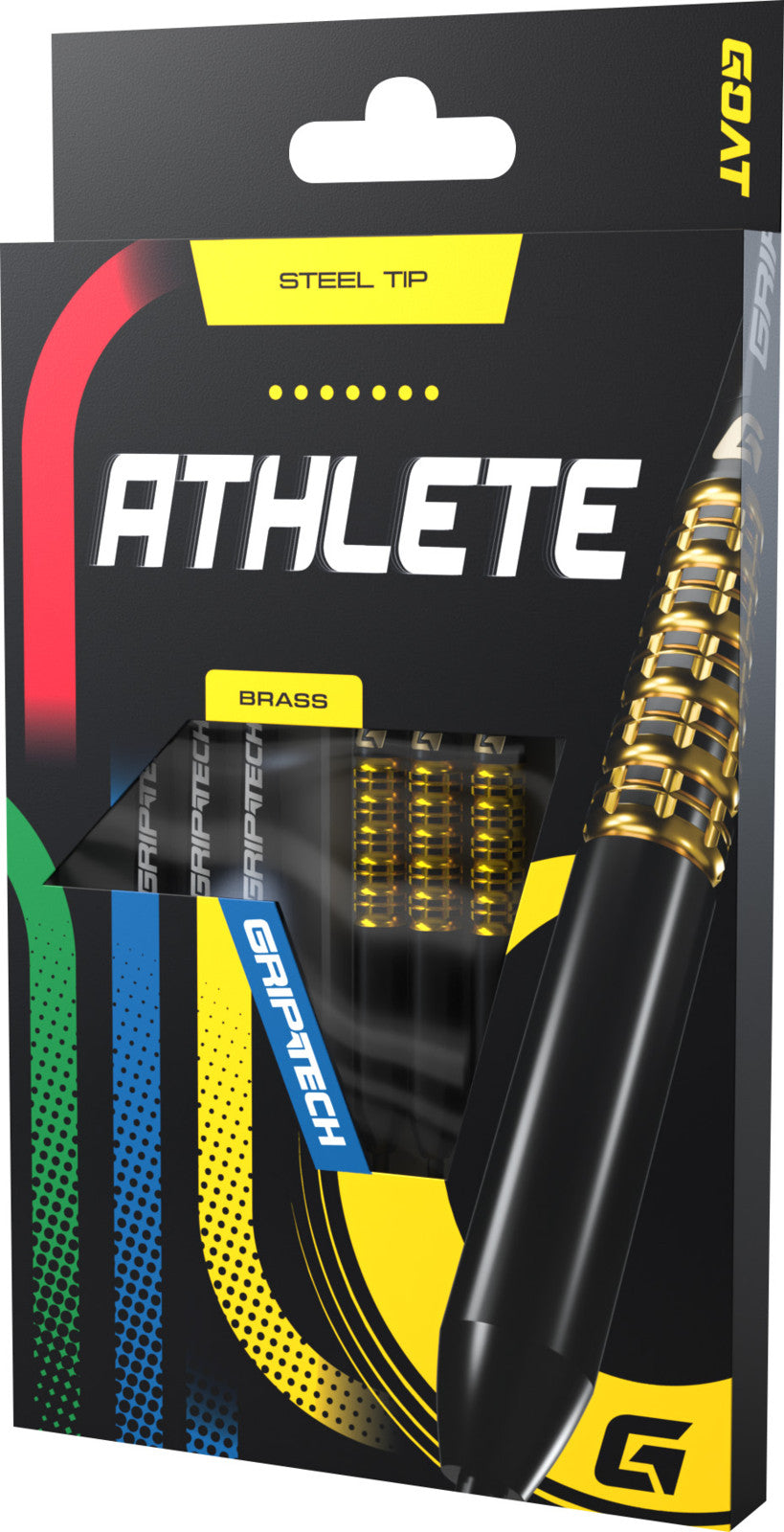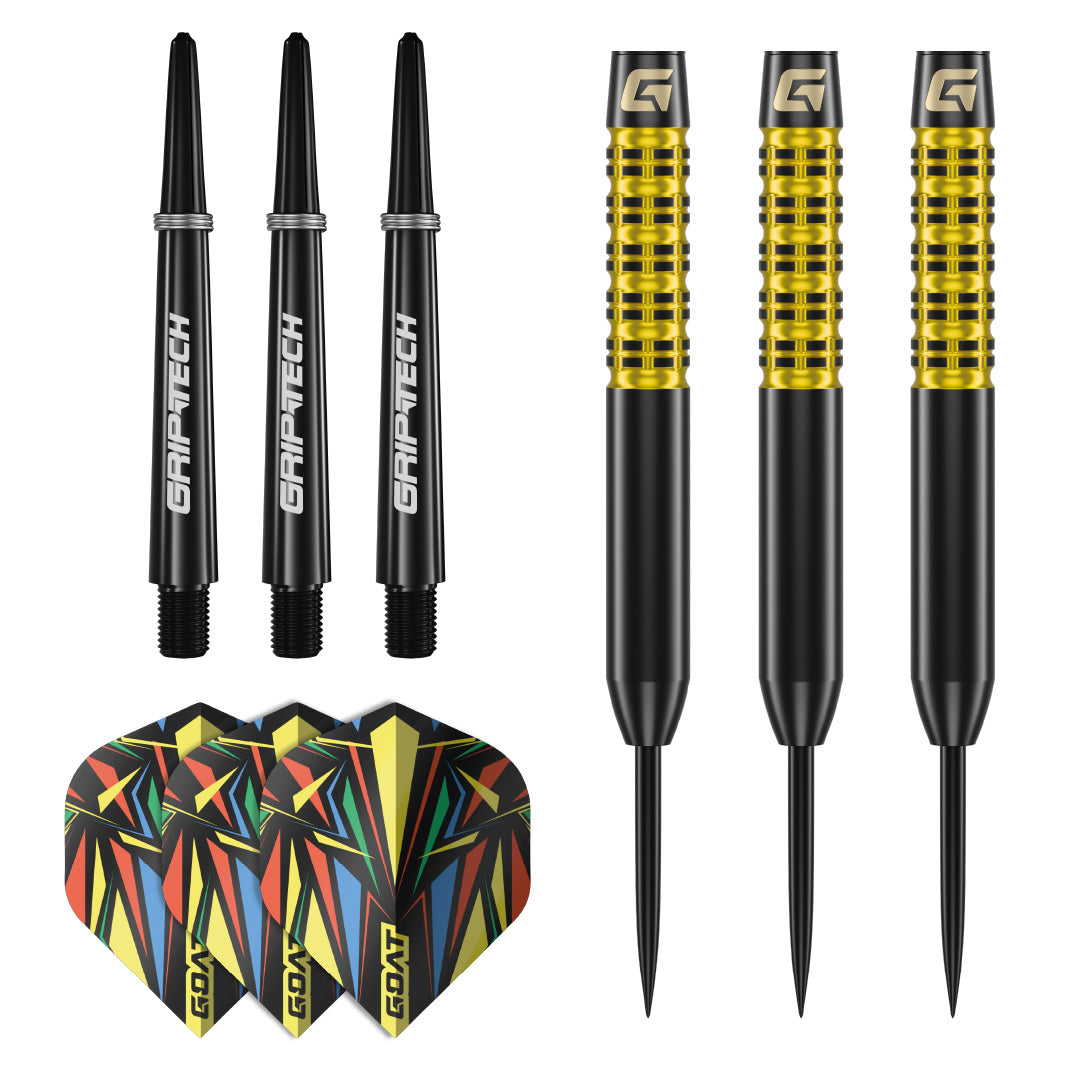 Inhoud van de verpakking: 3x GOAT - Athlete Brass - Yellow, 3x GOAT Griptech shafts en 3x GOAT Athlete flights.